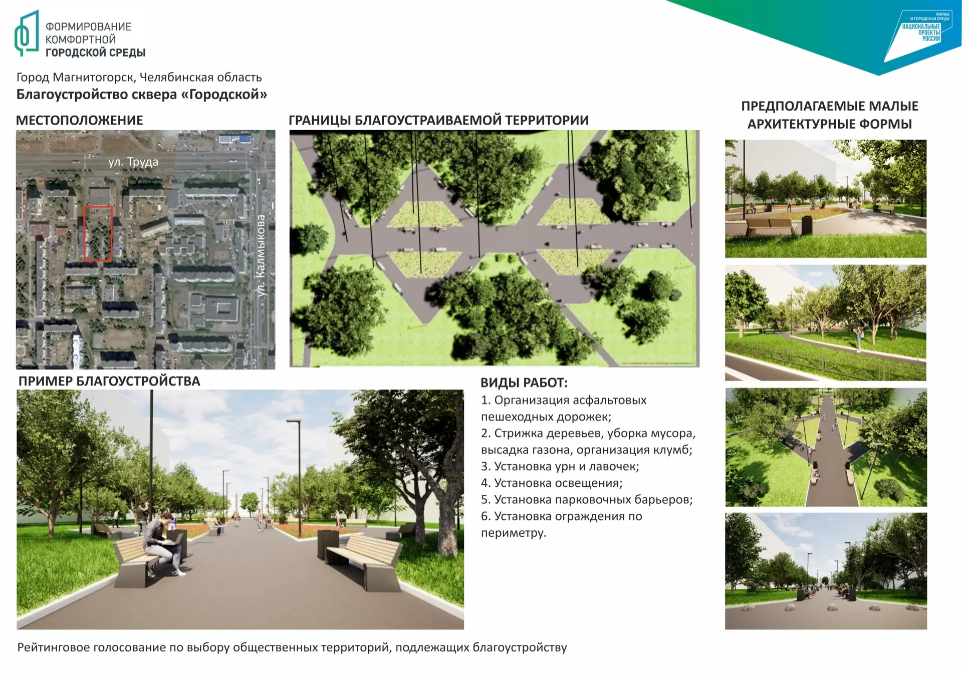 Напоминаем, что рейтинговое голосование пройдёт с 21 апреля по 12 июня. Если магнитогорцы скажут «да» скверу «Городской» — в 2027 году здесь появится обновлённое пространство для спокойных прогулок.