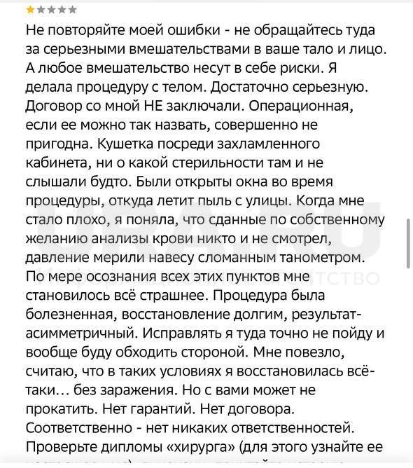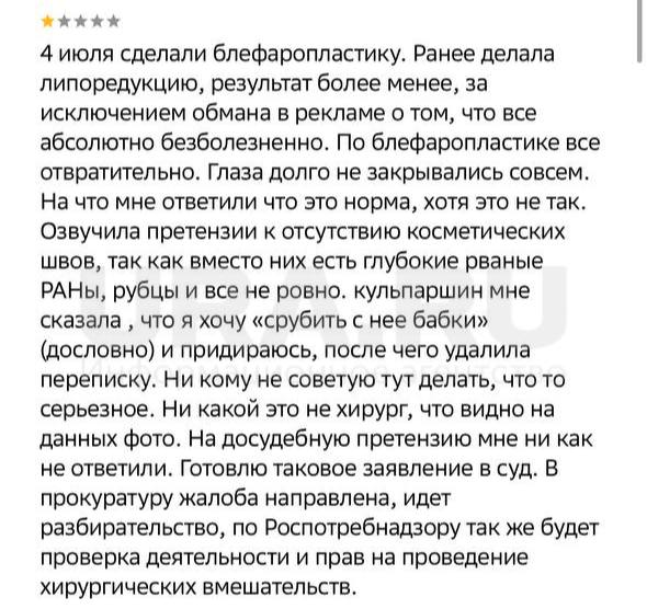 По информации источника URA.RU, на прием к начальнице попала 55-летняя женщина. После вмешательства у нее на лице в местах проколов образовались гнойные очаги. Другой девушке при блефаропластике повредили веко, поэтому ее глаз теперь не закрывается. Помимо этого, в клинике проводят интимное омоложение лазером, после которого у одного из клиентов диагностировали недержание мочи. Пациенты утверждают, что в помещении царит антисанитария, что подтверждают и отзывы.