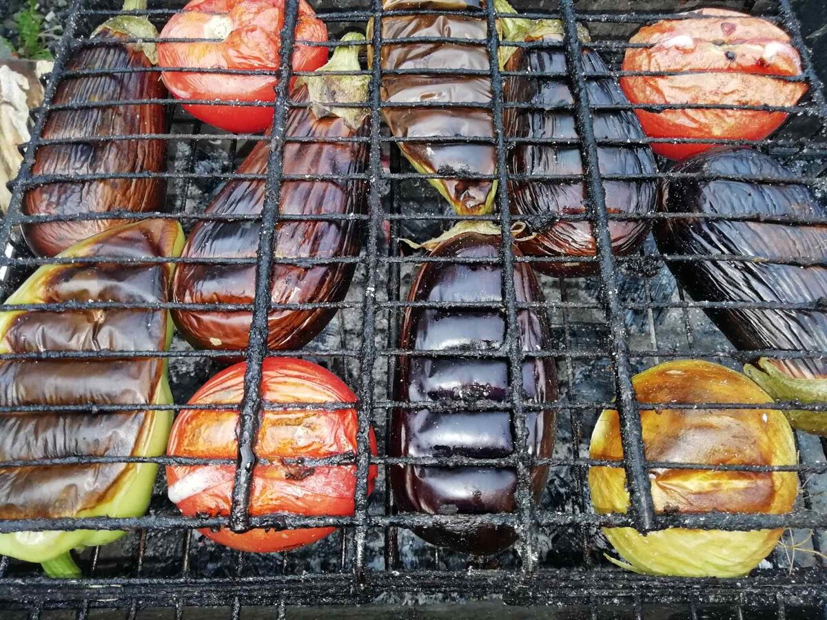 Для начала на гриле или мангале необходимо обжарить овощи в кожуре — это помидоры, баклажаны, перцы и кабачки. Такой метод запечатывает соки внутри, создавая невероятный вкус.