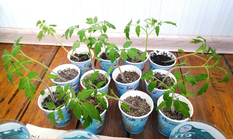 - Для первой пересадки подойдут маленькие стаканчики объемом около 200 мл, где томаты заглубляются на 2-3 см.