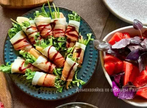 После обжаривания груши нужно уложить на тонкие ломтики хамона. Соответственно, хамон можно заменить на прошутто или любое другое сыровяленое мясо — главное, чтобы оно было тонко нарезано и хорошо сочеталось по вкусу. Дальше добавляется свежая рукола, а вся конструкция сворачивается в аккуратные рулетики и укладывается на красивую тарелку.