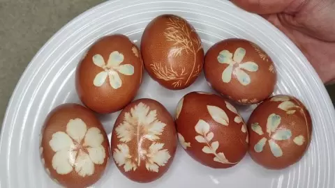 После нанесения узоров оберните яйца капроном, фиксируя элементы на месте. Затем поместите их в отвар из луковой шелухи на 30 минут — для более выраженного цвета лучше оставить на ночь. После того как яйца достигли желаемого оттенка, вынимайте их и дайте полностью высохнуть на бумажном полотенце. Для эффекта блеска можно слегка смазать поверхность растительным маслом.